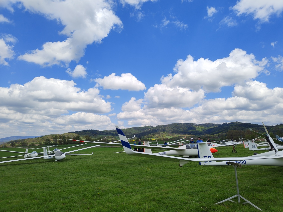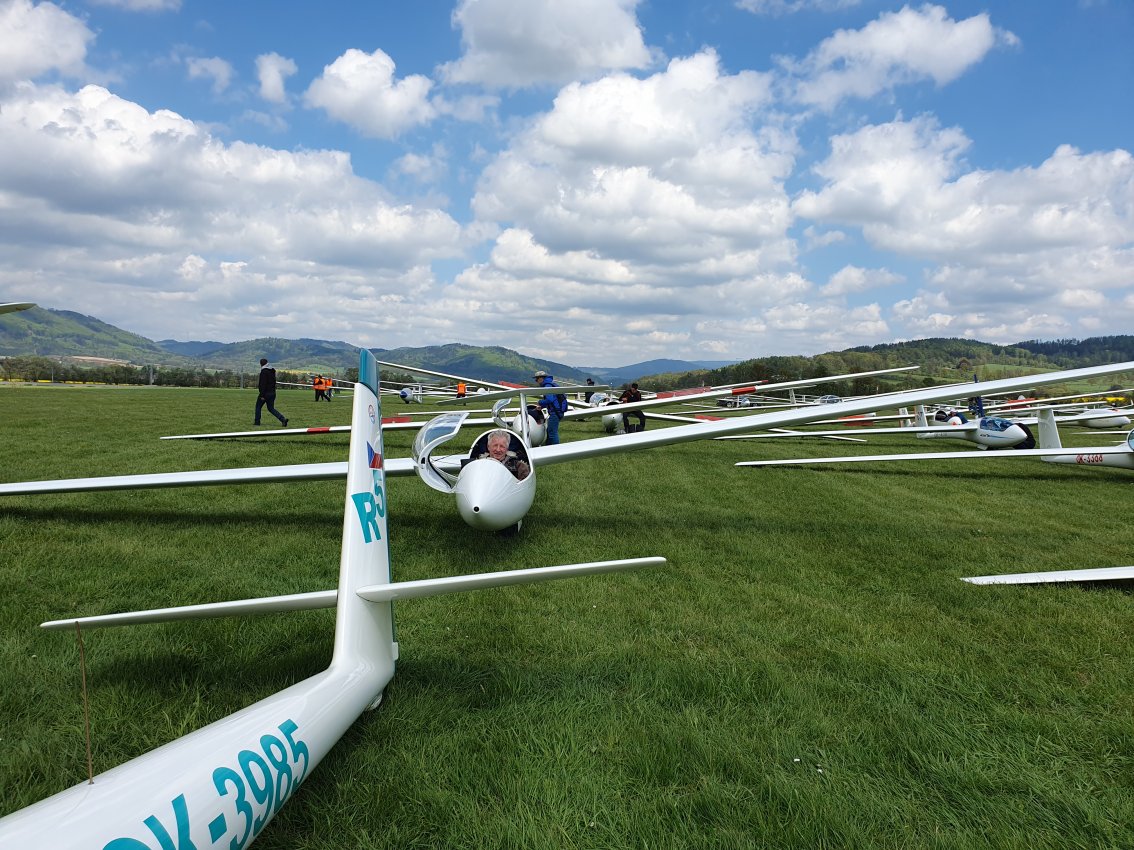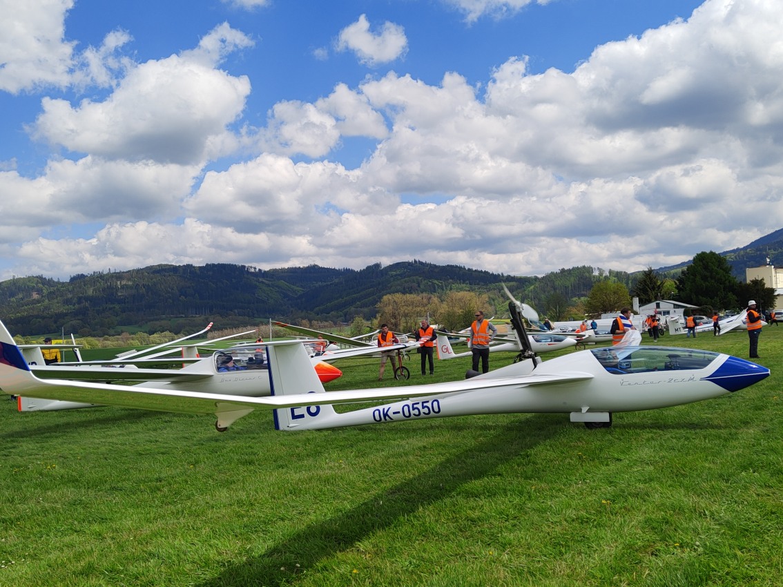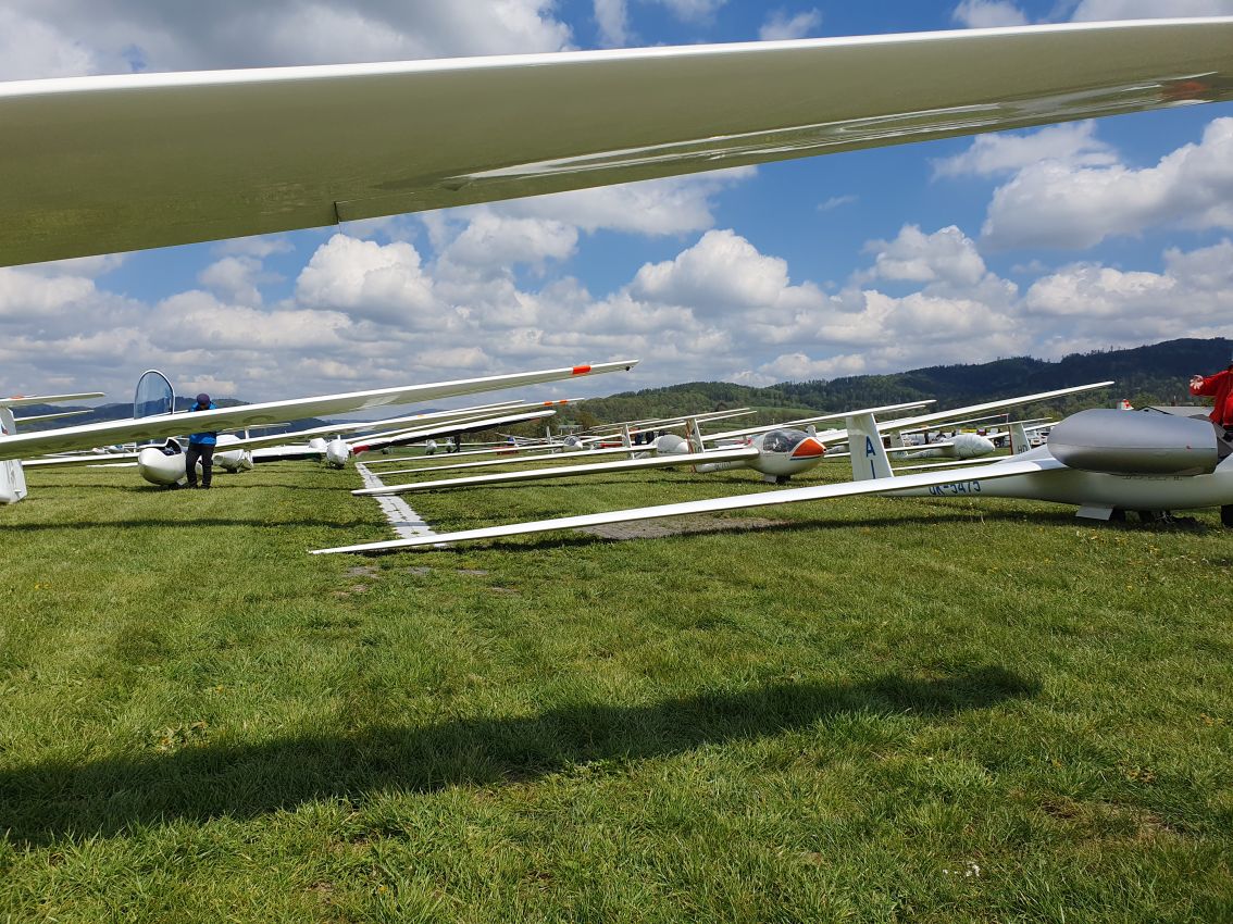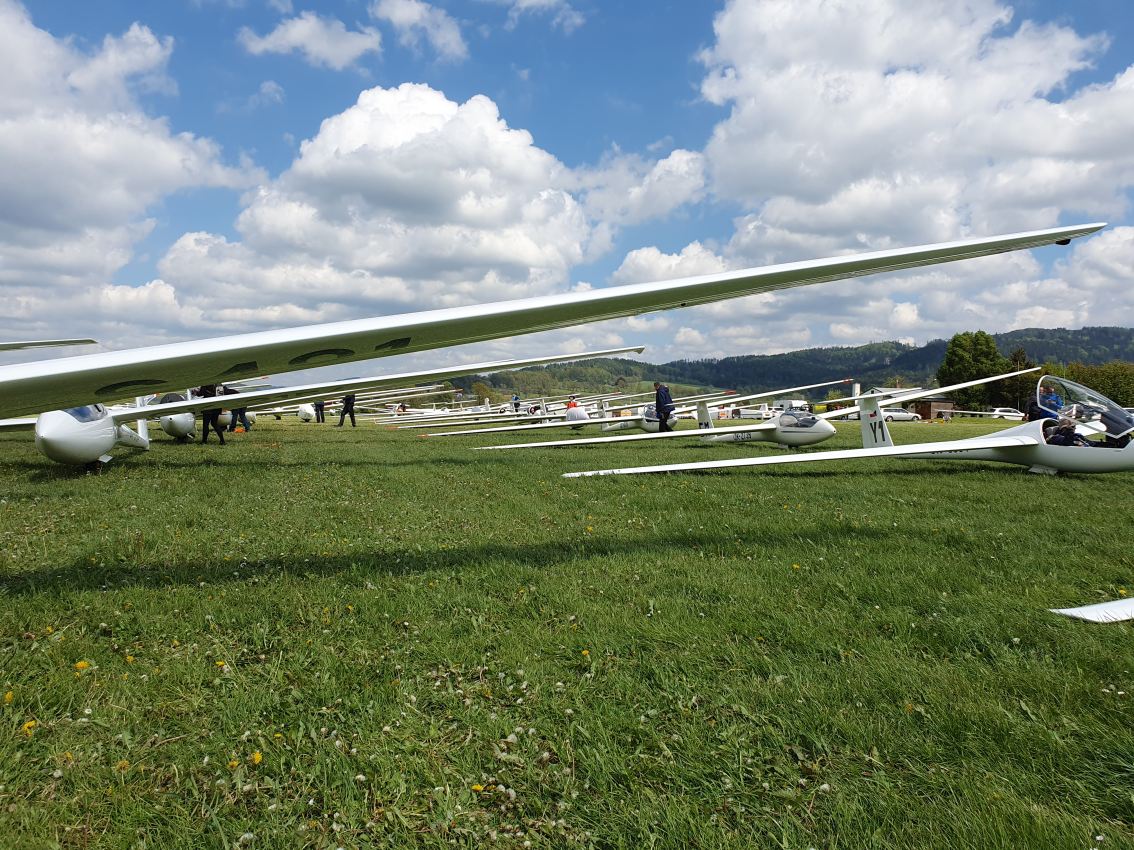 Na gridu už přibývají větroně, hlavně tedy soutěžní třídy Kombi, která je u nás umístěná vždy vzadu kvůli vyšší hmotnosti větroňů naplněných vodní přítěží a potřebou delší dráhy pro vzlet.