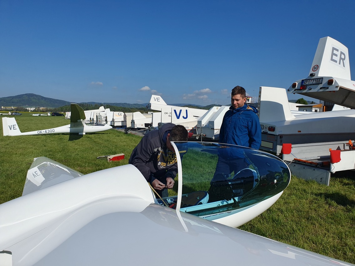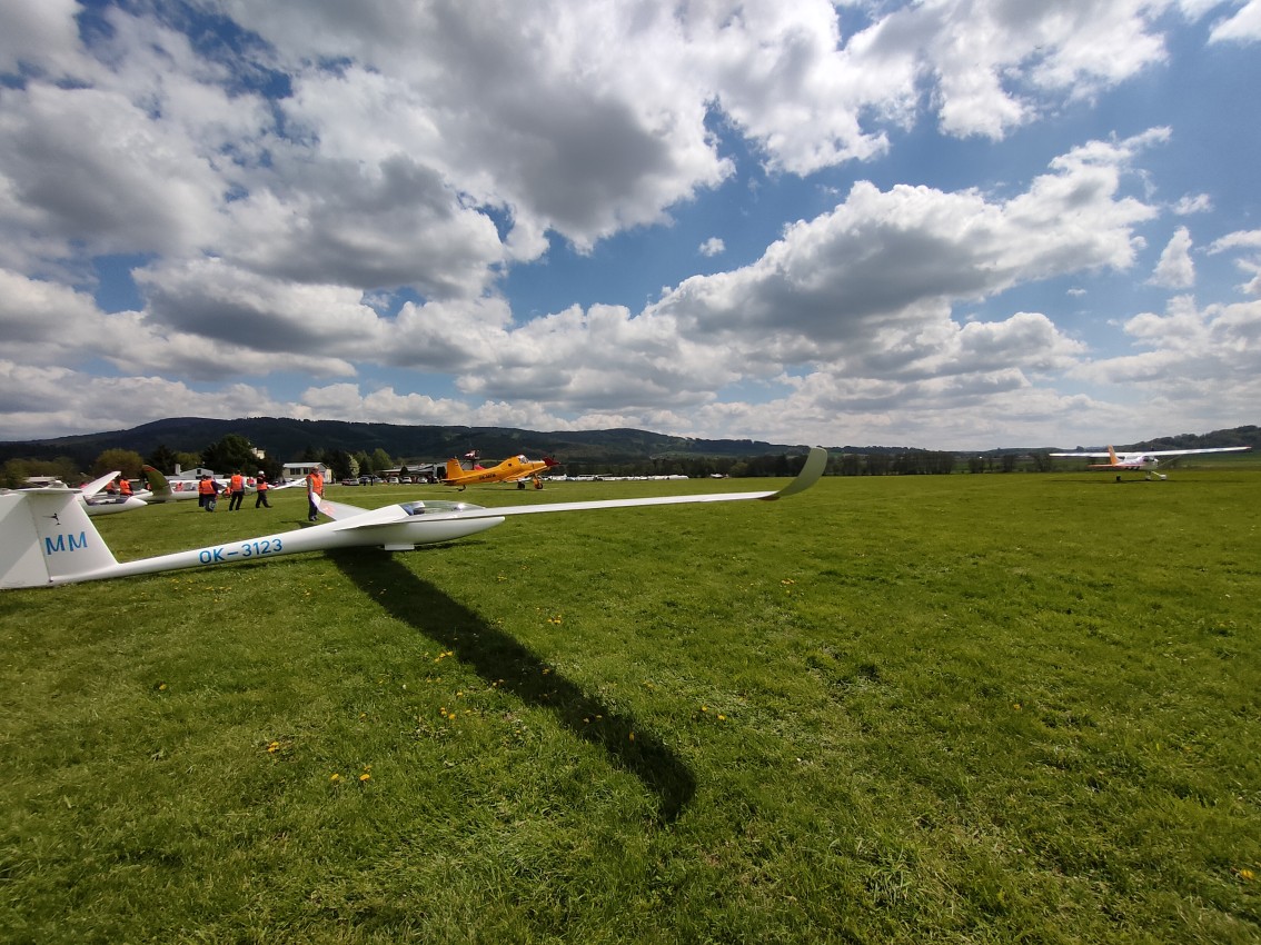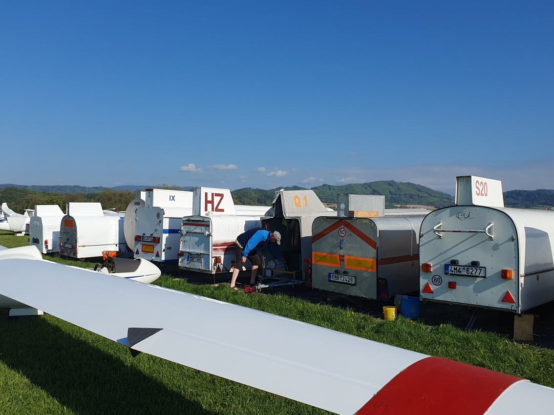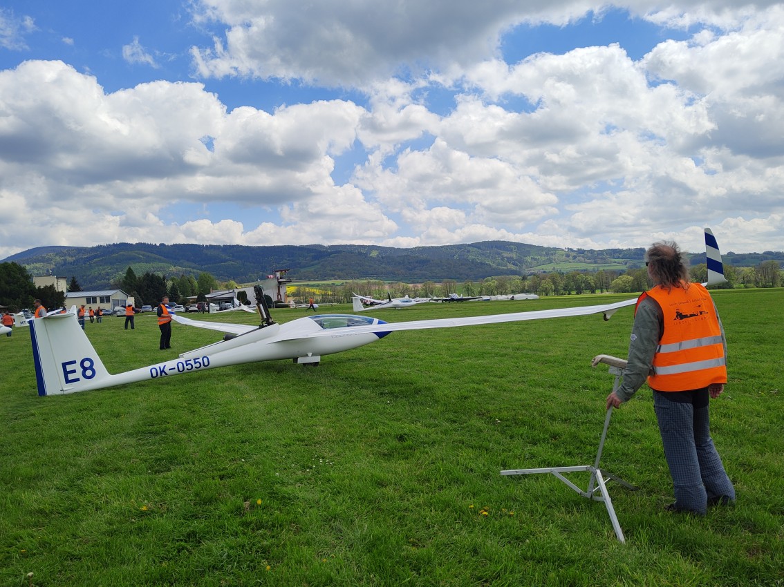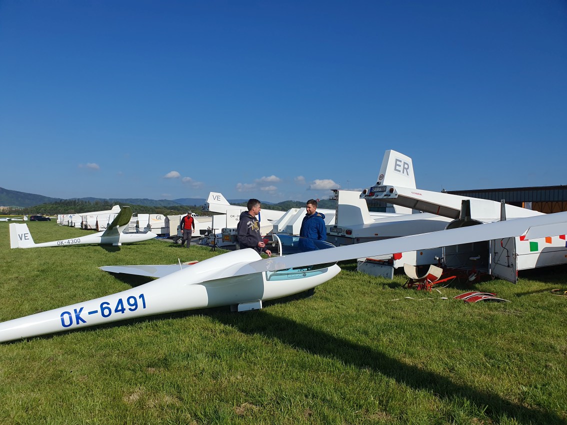 Na gridu už přibývají větroně, hlavně tedy soutěžní třídy Kombi, která je u nás umístěná vždy vzadu kvůli vyšší hmotnosti větroňů naplněných vodní přítěží a potřebou delší dráhy pro vzlet.