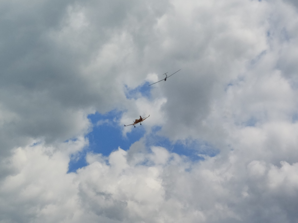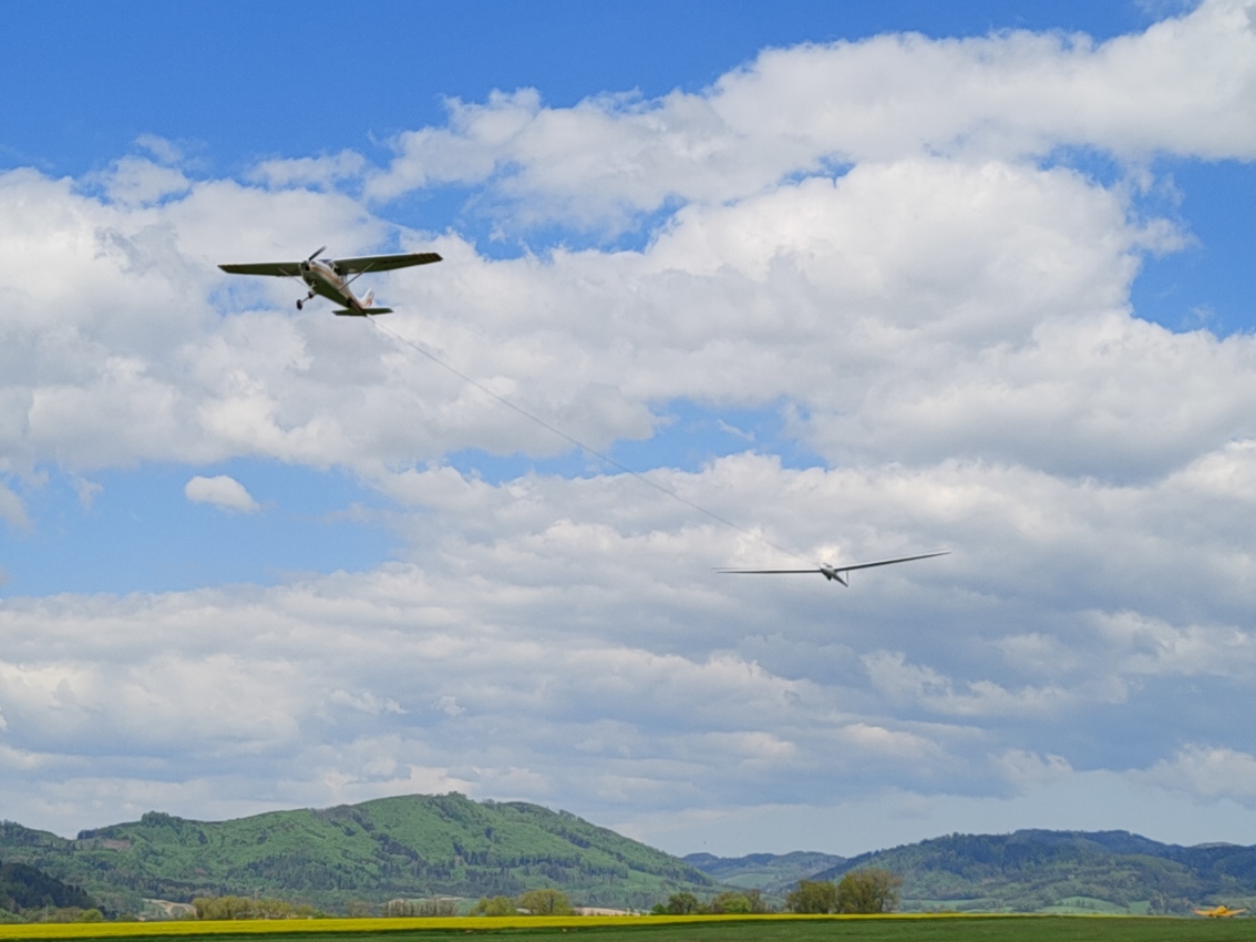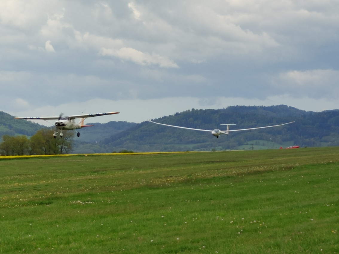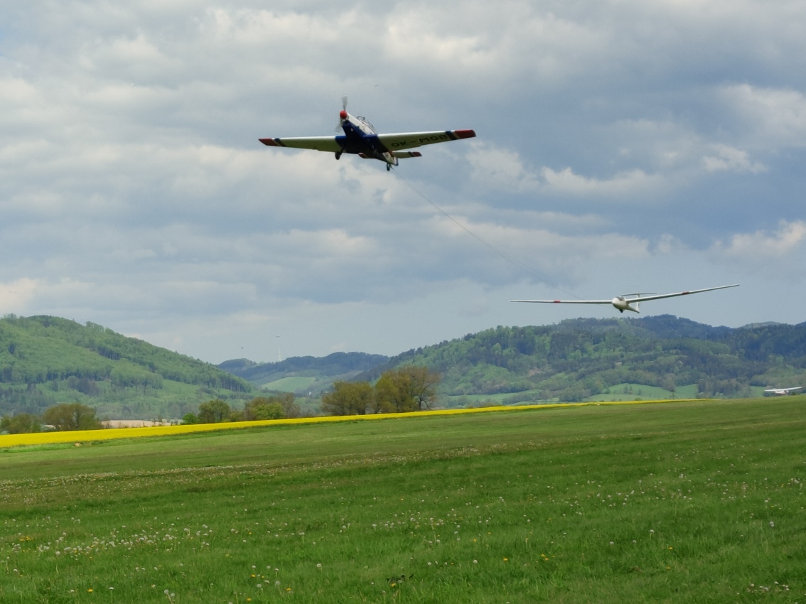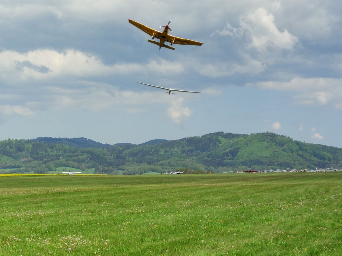 stroje uz jsou ve vzduchu. Počasí se rychle zhoršilo, z jihu se natahuje vysoká oblačnost. Pěkné mraky slibující stoupání na Orličkách, se slévají.